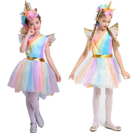 გოგონას უნიკორნის კოსტუმი ცისარტყელას კაბა ფრთიანი თავსაბურავით საზეიმო წვეულებისთვის GH-8001