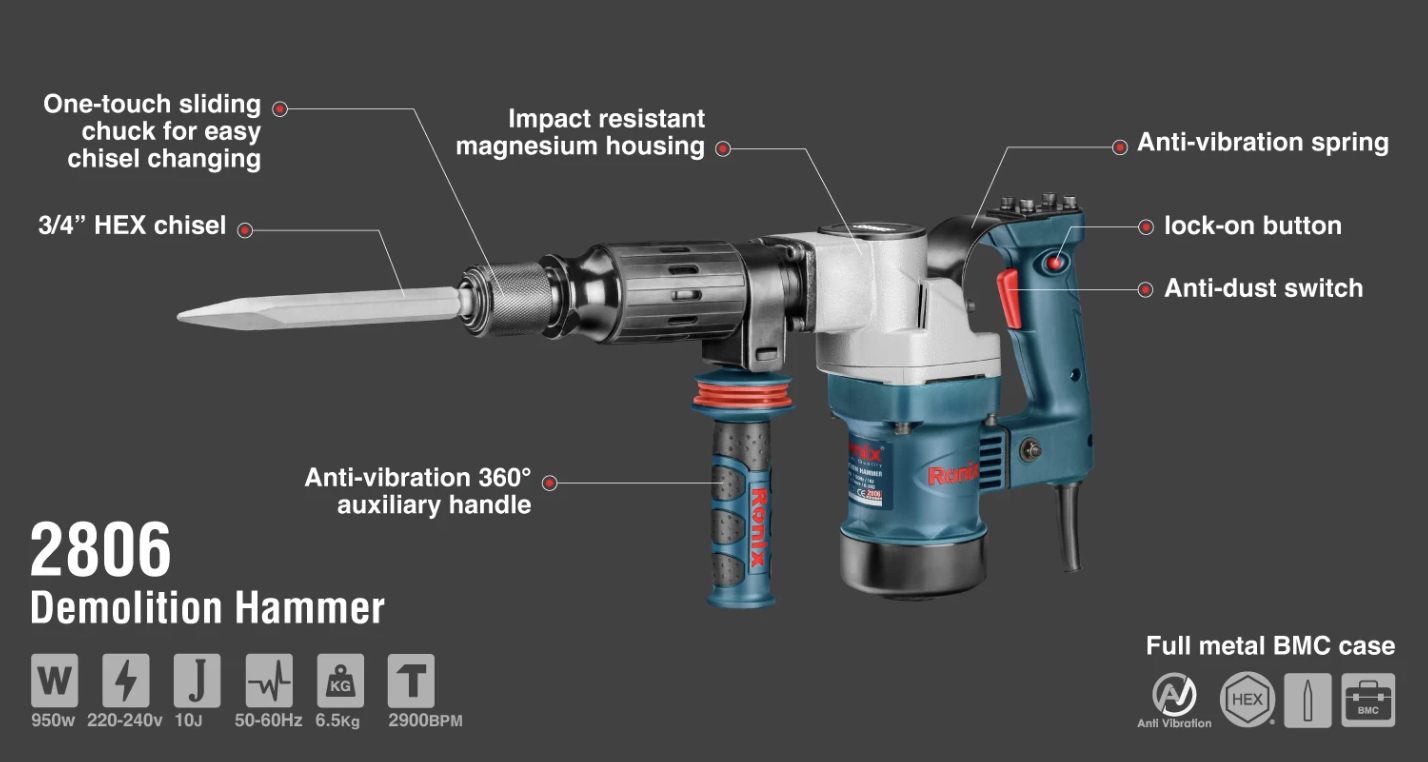 ♦950w გამძლე ძრავა გამოიმუშავებს 10J დარტყმით ძალას, რომელიც